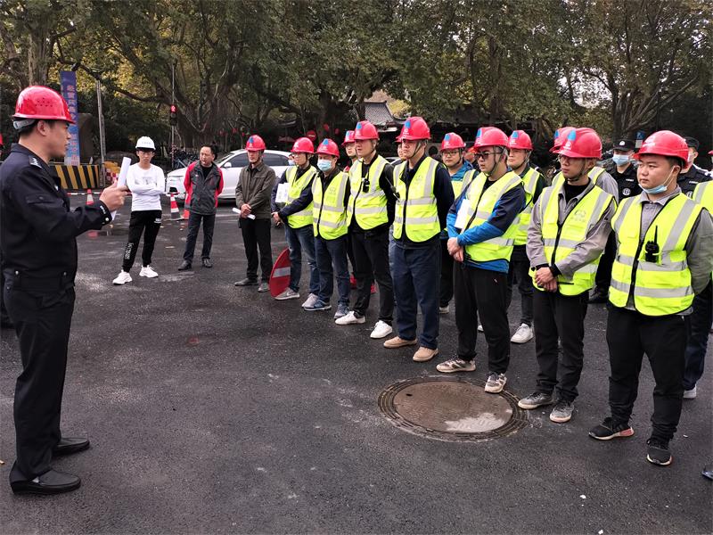 此次采用爆破法施工的松木场站岩层强度较高(部分区域强度超100Mpa),施工难度大,土方破除采用传统的机械破除效率偏低。为缩短工期,加快完成土方开挖工作,项目决定对松木场西区第二段第三层土方进行定点爆破。该站点位于曙光路与杭大路交汇处,地理位置特殊,毗邻小百花剧院、老年大学、陈经纶体校和世贸酒店,人流车流量大。为顺利完成首次爆破任务,项目部制定了周密的基坑爆破警戒方案,前后开展两次警戒演练工作,同时对现场反复踏勘,为后期的正式爆破做足了准备。爆破当天,在杭州市公安局统一指挥下,项目部成立了临时基坑爆破警戒领导小组,分局党委委员、副局长程军担任组长,分局党委委员、治安大队大队长俞华标任副组长,同时出动特警大队,西湖交警大队等63名警力联合完成任务,现场共设置11条警戒点,3条道路卡点和1支现场巡逻队,警企分工明确,各司其职,为爆破工作的顺利完成保驾护航。
