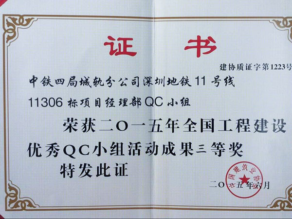 近日,城轨分公司深圳地铁项目部关于《减小淤泥地层管片错台超标率》的QC成果荣获中国建筑业协会2015年度全国工程建设优秀QC小组活动成果三等奖。